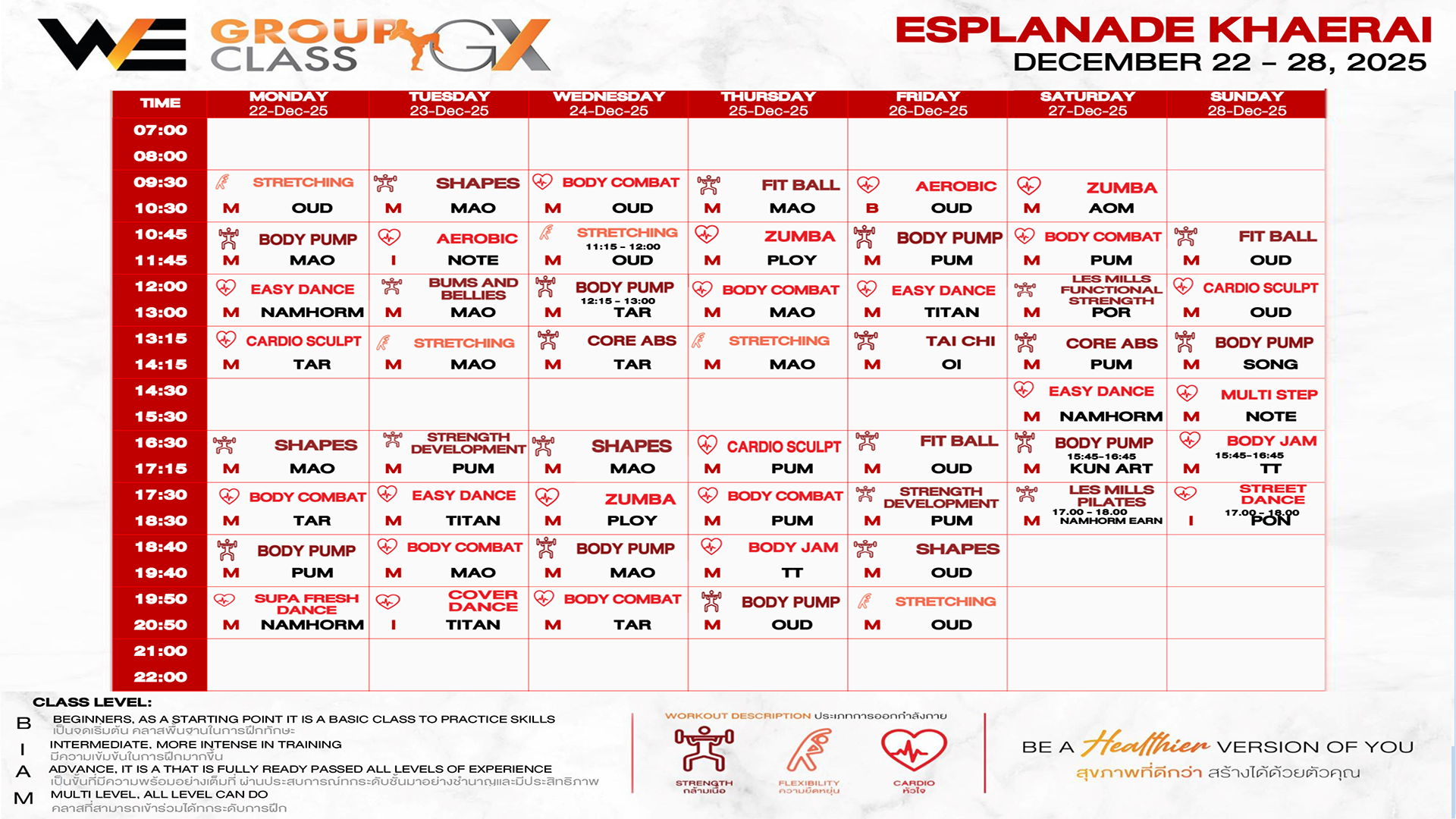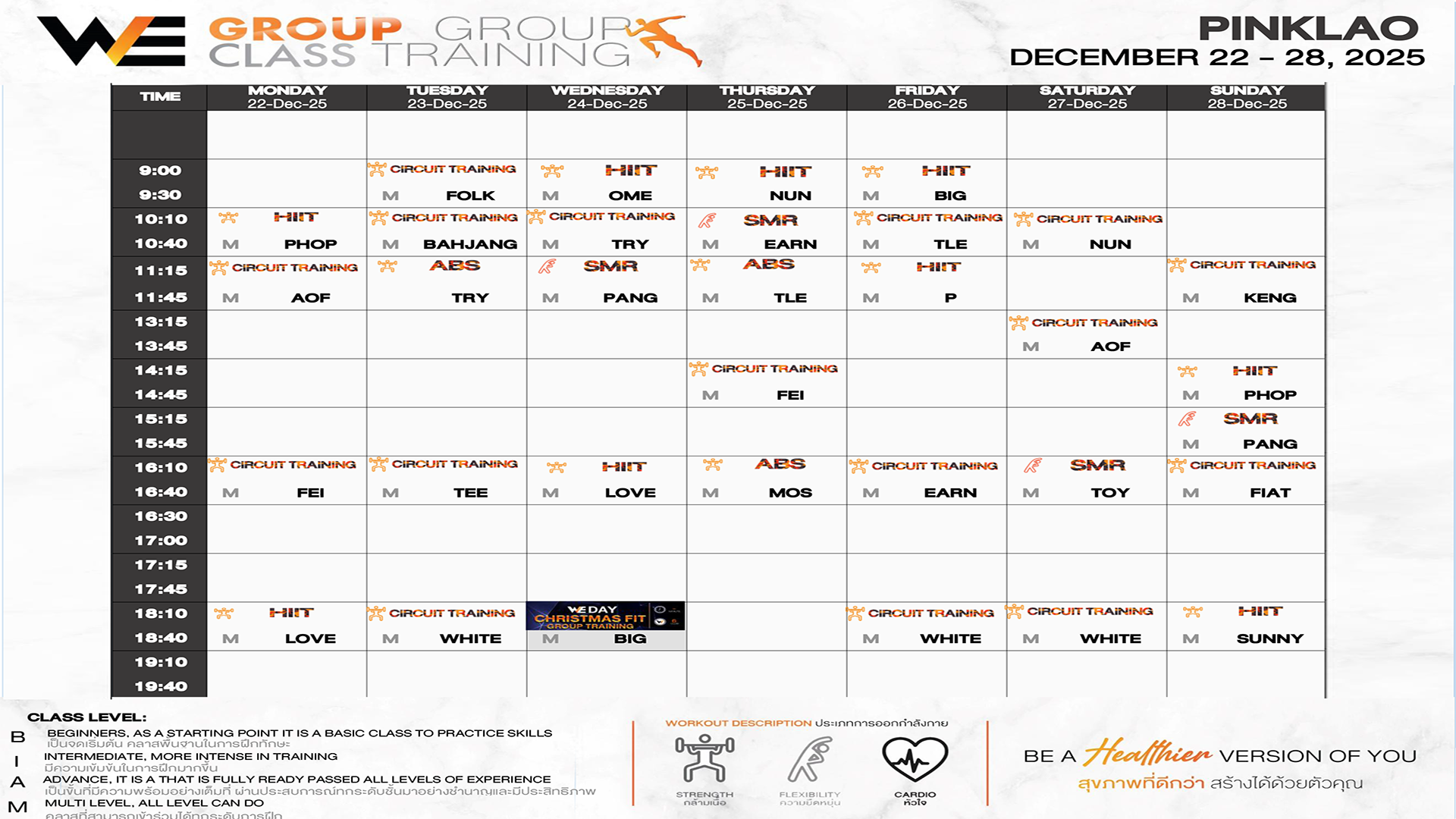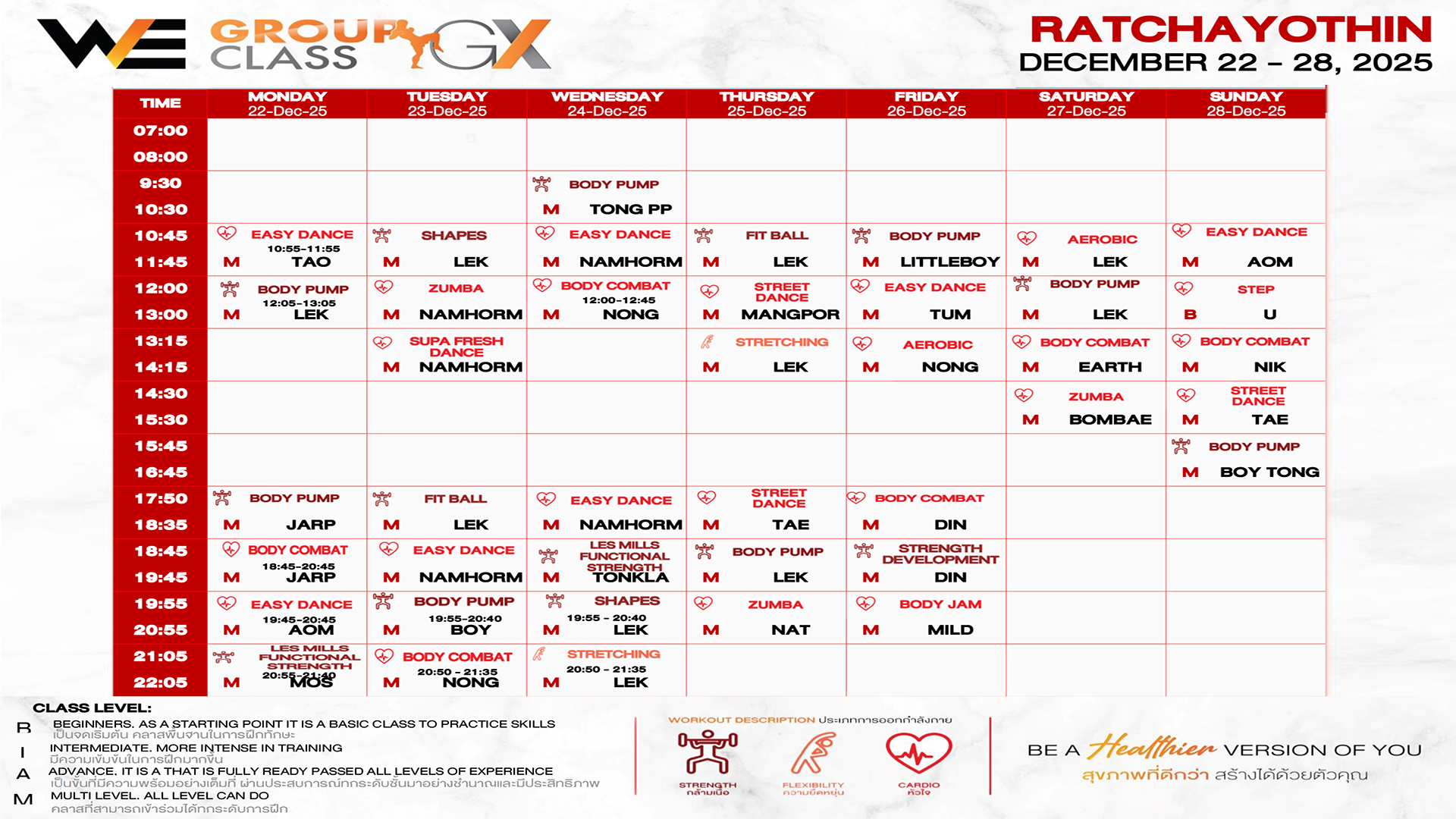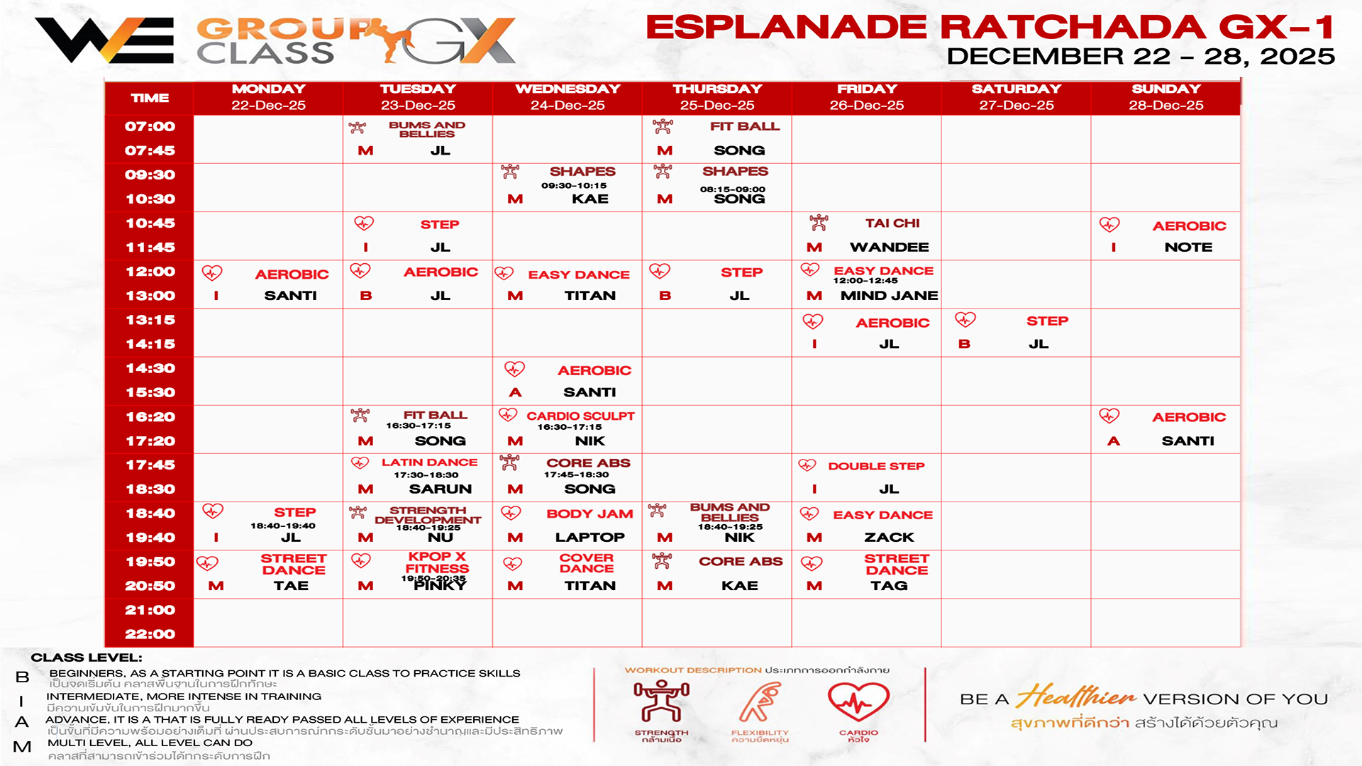 ตารางคลาส วี ฟิตเนส ระหว่างวันที่ 22-28 ธันวาคม 2568