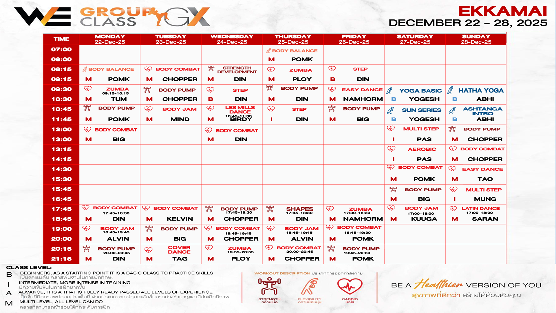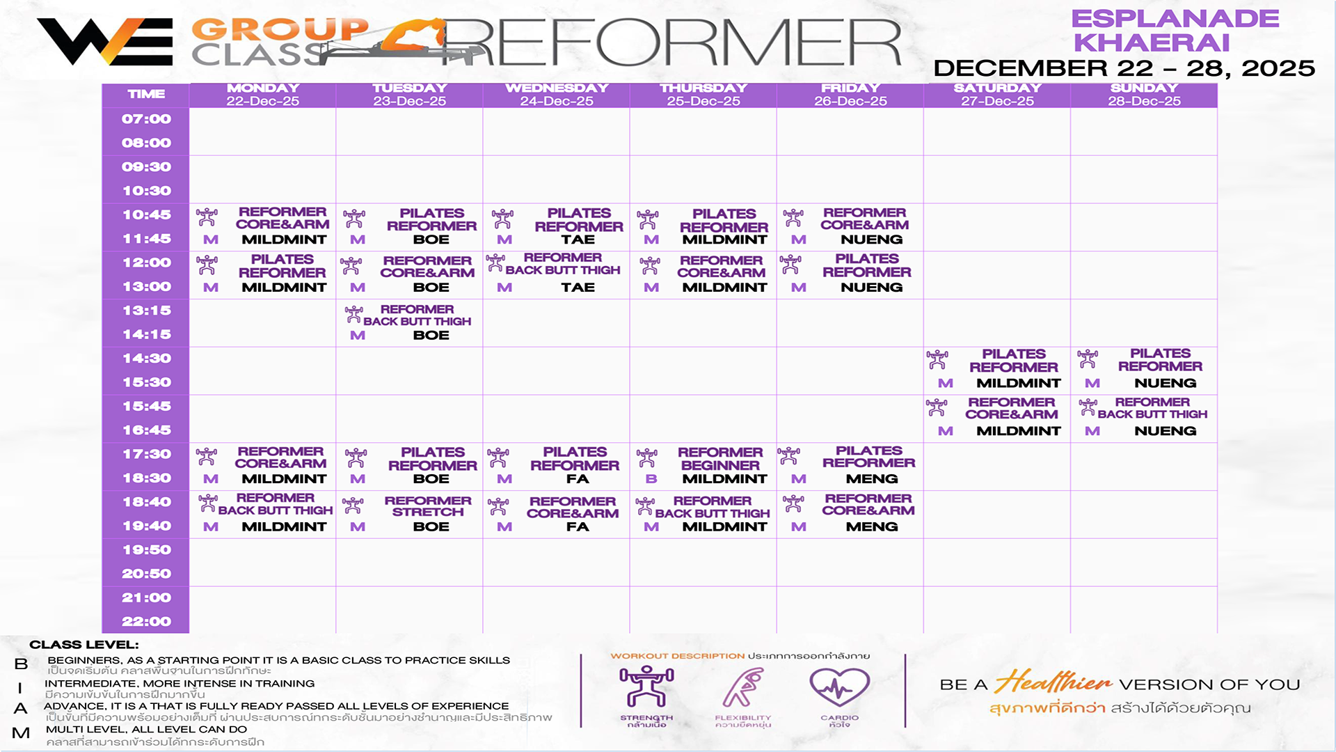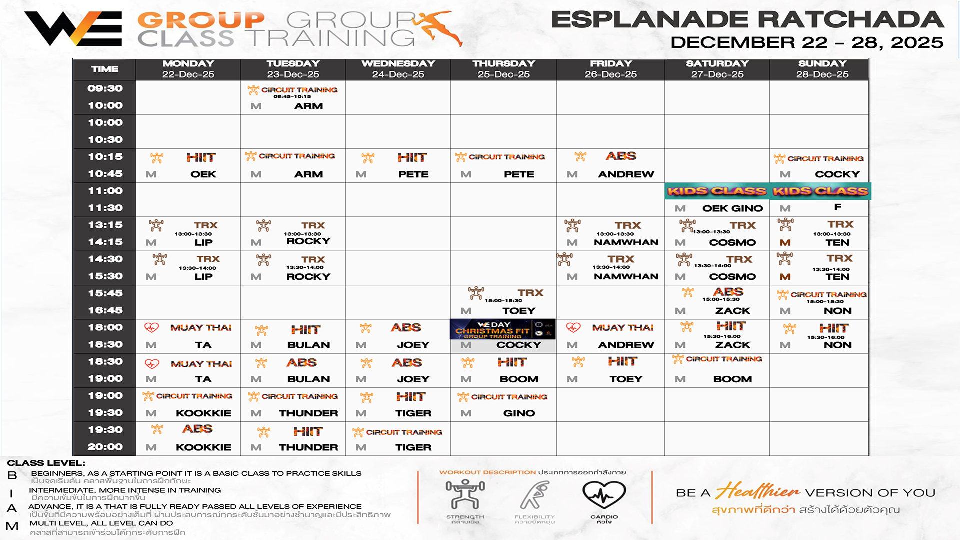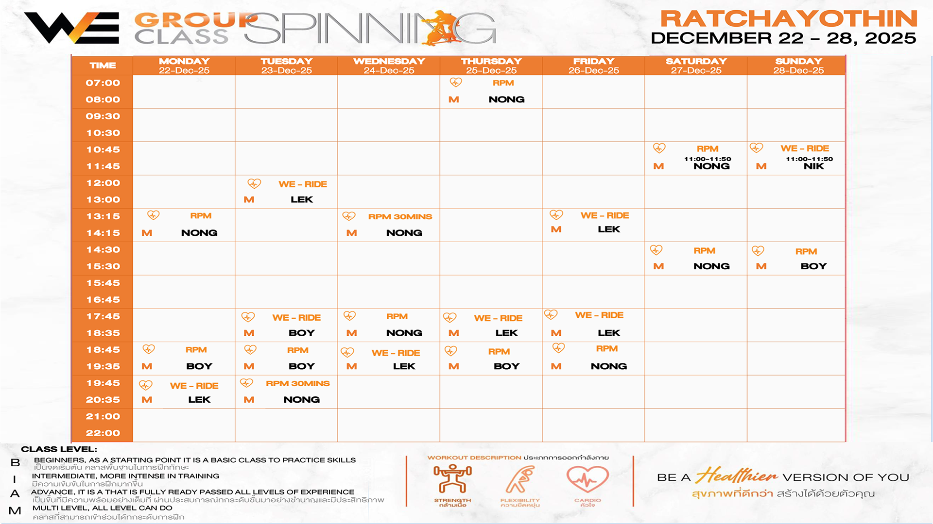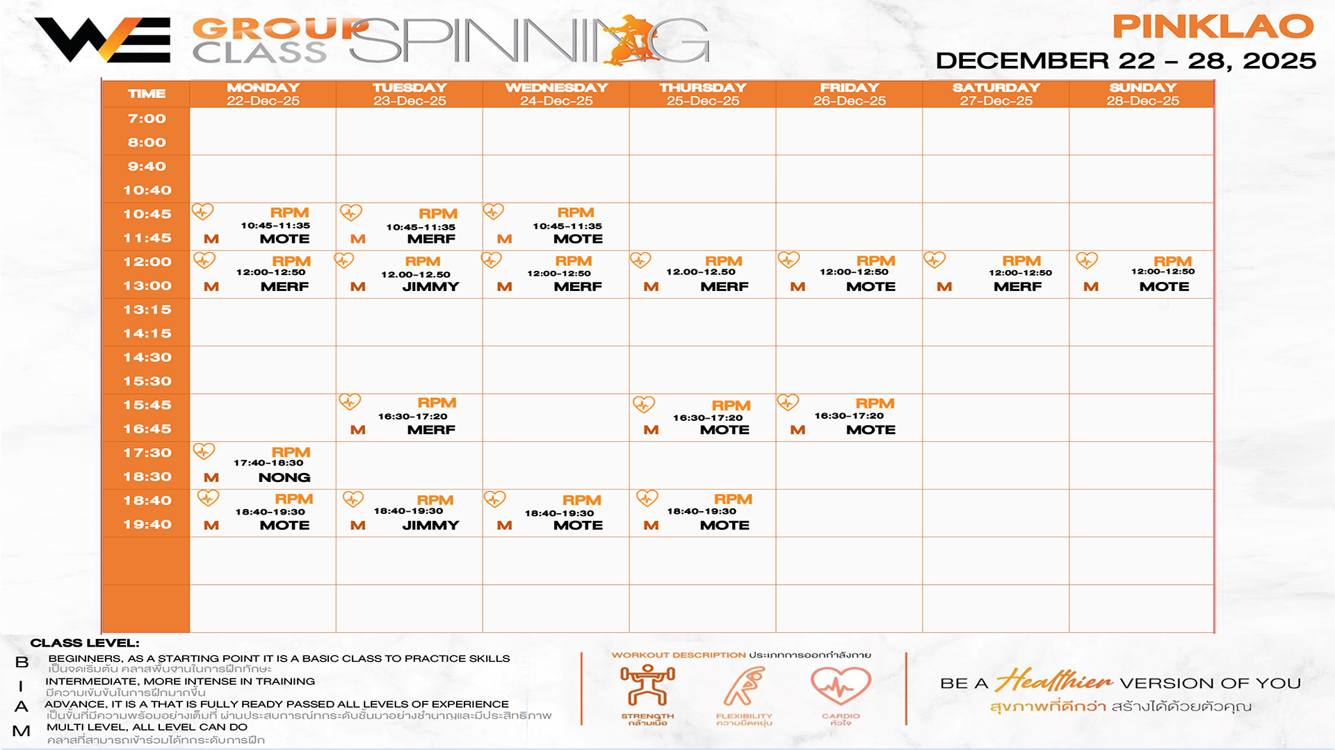 ตารางคลาส วี ฟิตเนส ระหว่างวันที่ 22-28 ธันวาคม 2568
