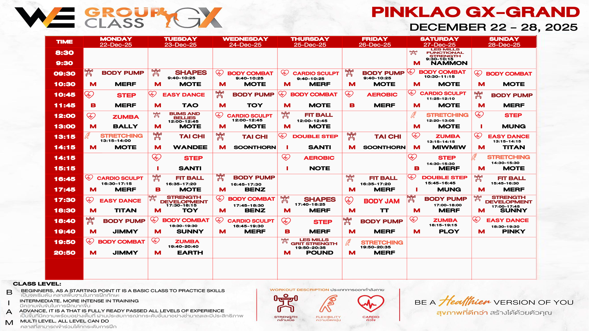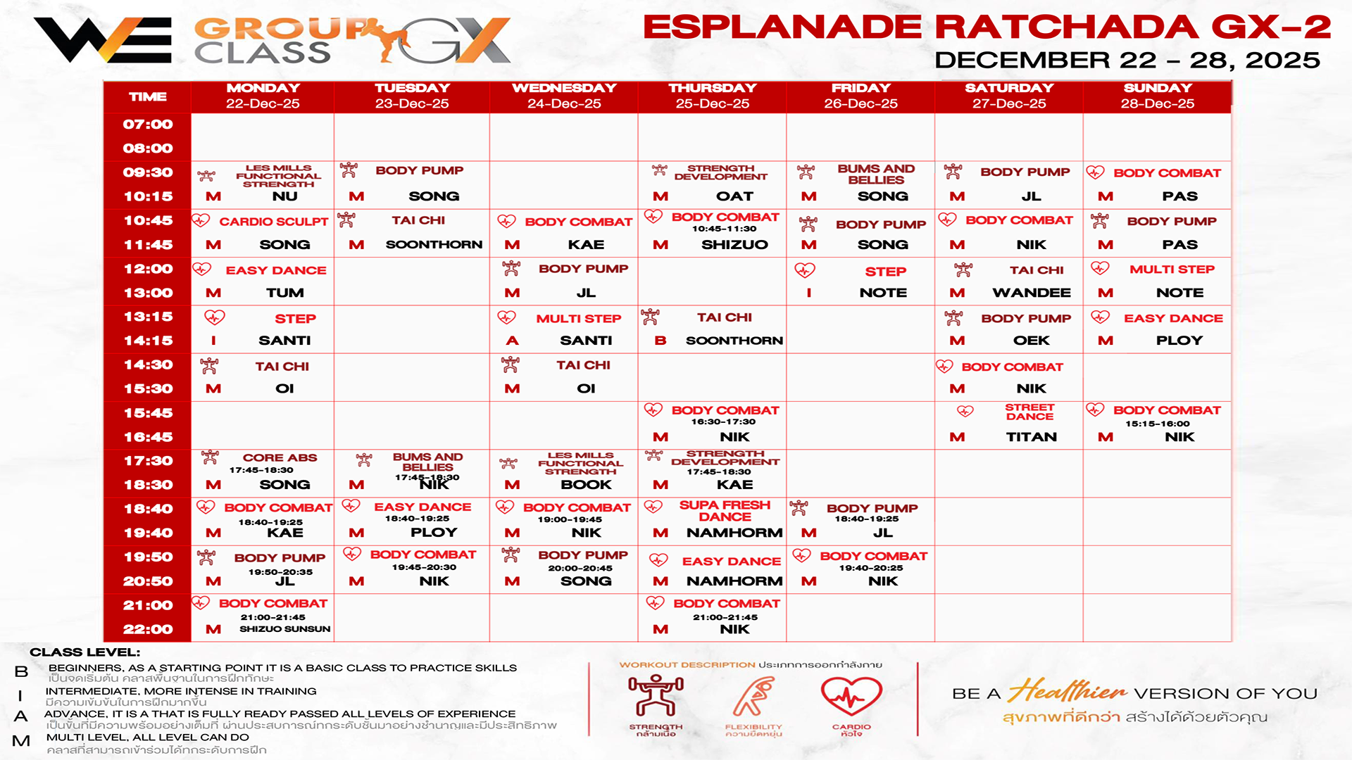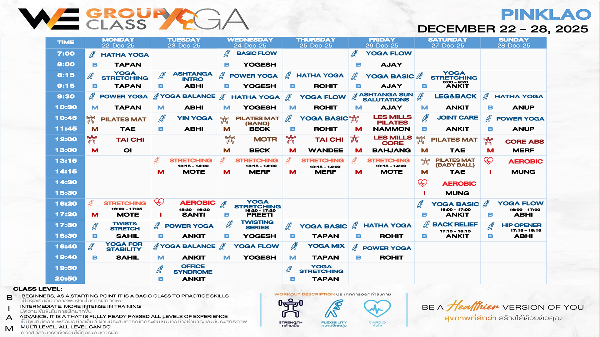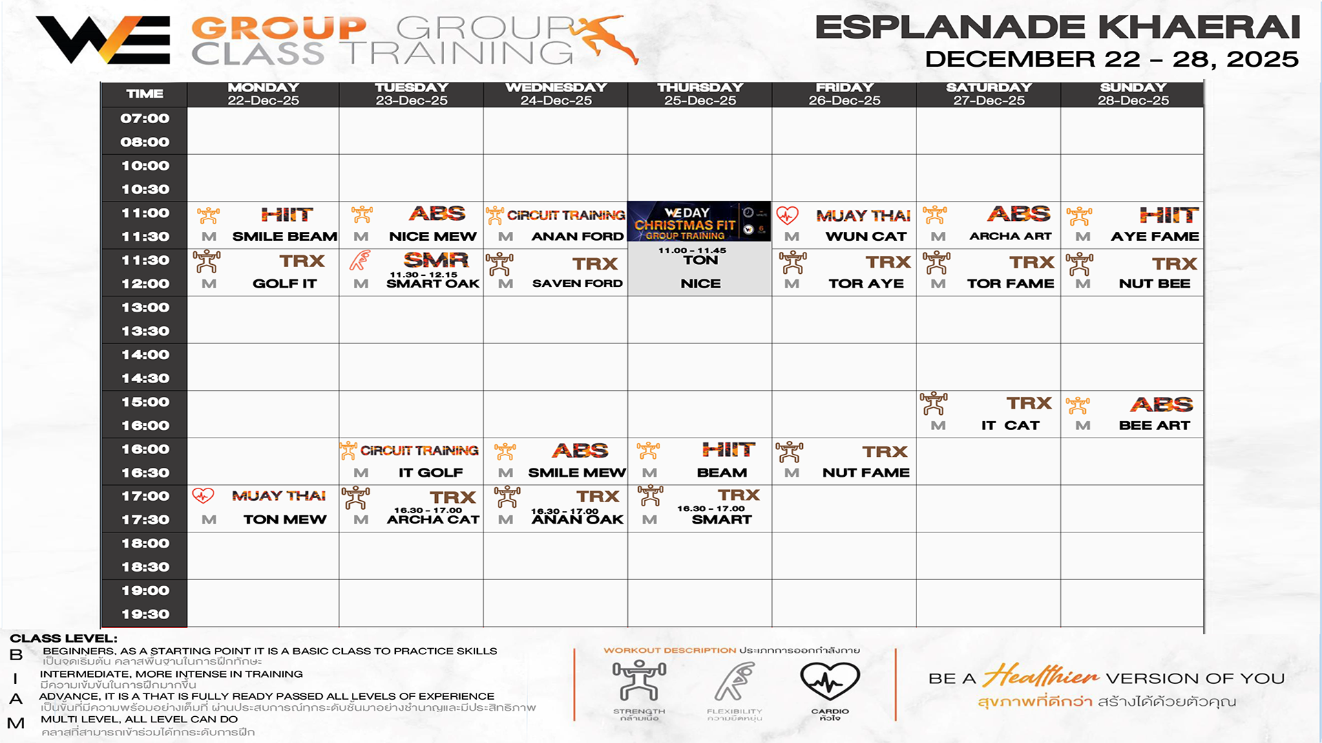 ตารางคลาส วี ฟิตเนส ระหว่างวันที่ 22-28 ธันวาคม 2568