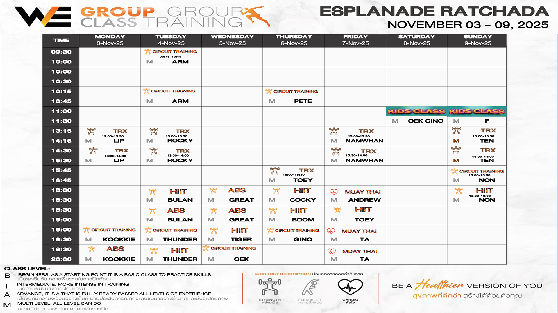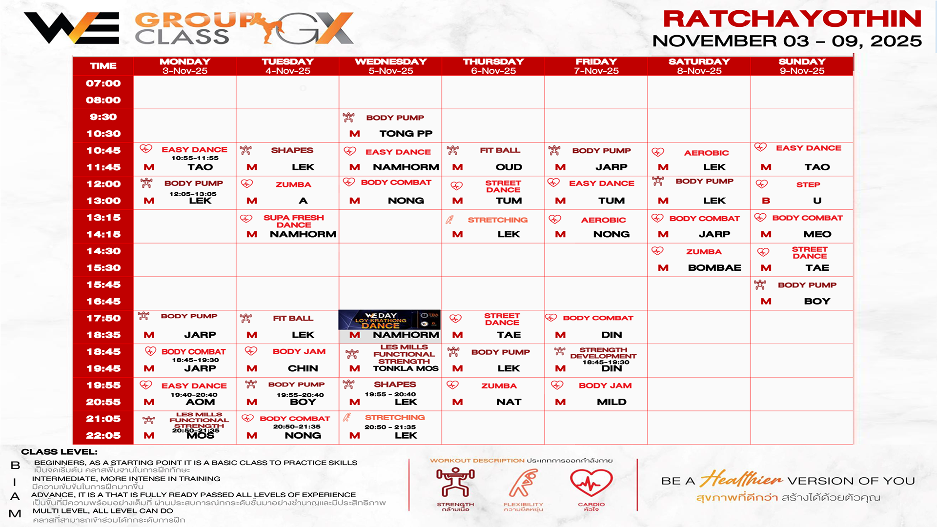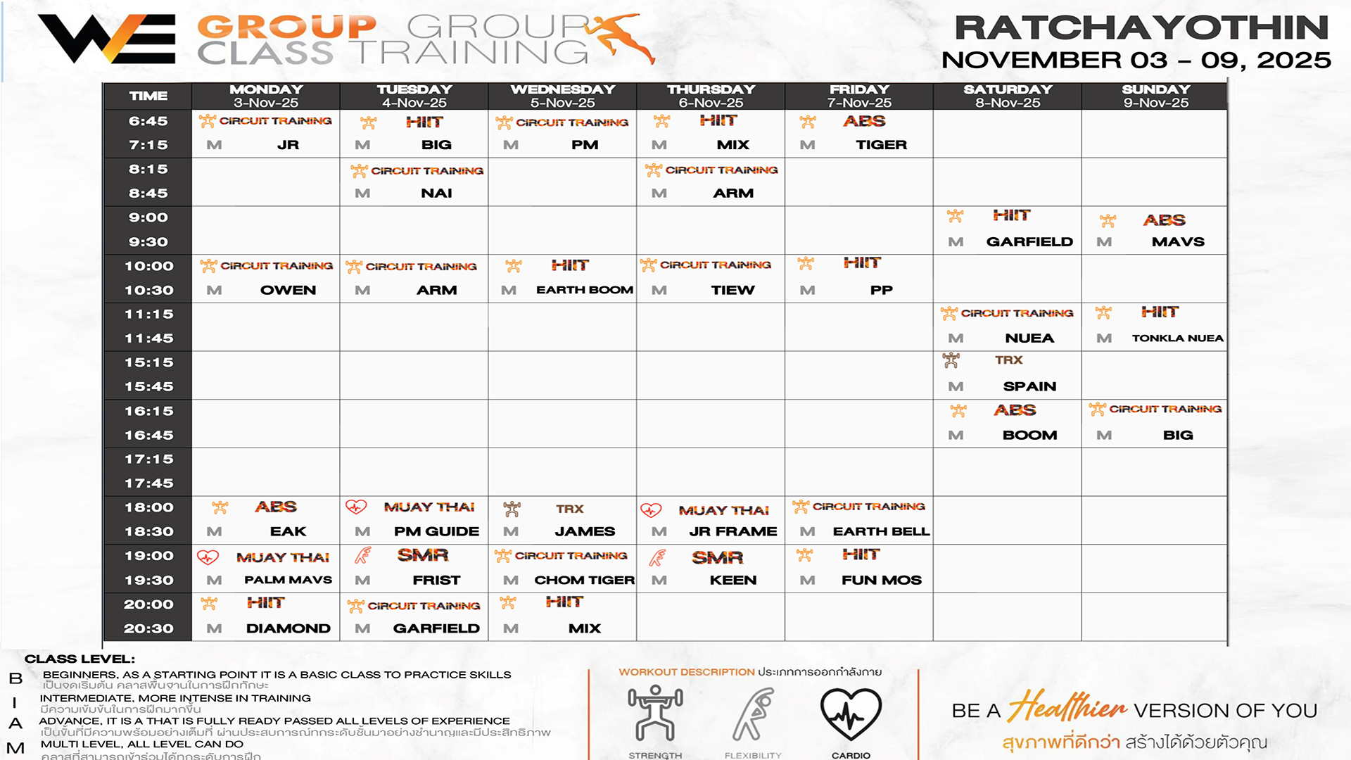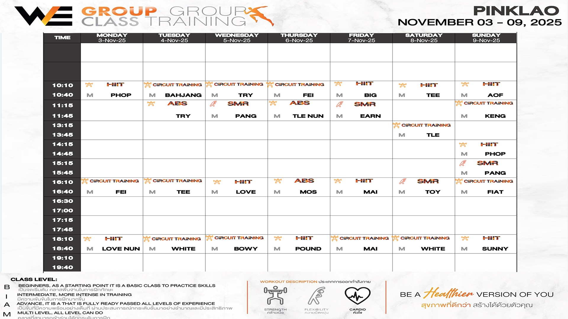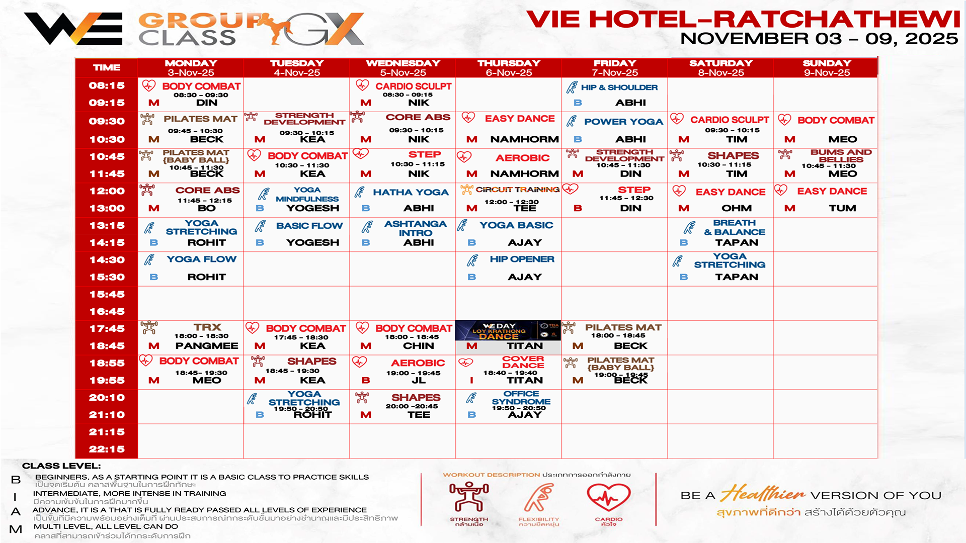 ตารางคลาส วี ฟิตเนส ระหว่างวันที่ 3 – 9 พฤศจิกายน 2568